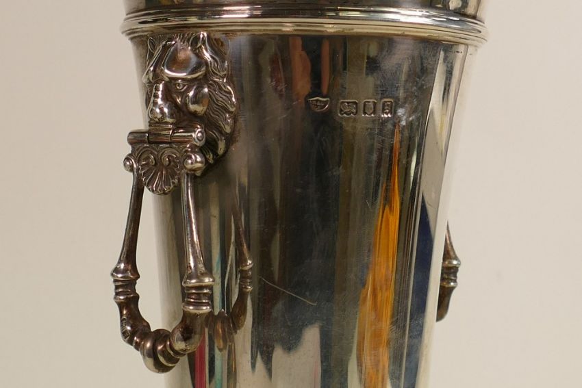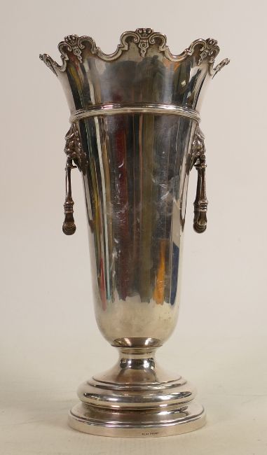 Silver two handled vase: Hallmarked for London 1922, lions head handles, 892.9g.