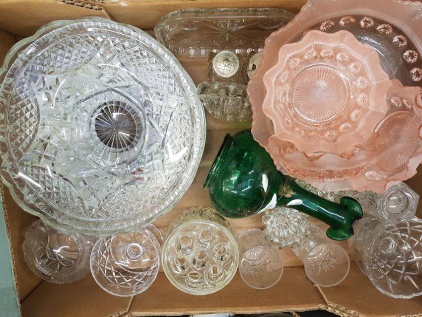 A mixed collection of glassware items to include Fruit bowls, dessert set, hand blown Gregory Mary style green jug etc (1 tray)