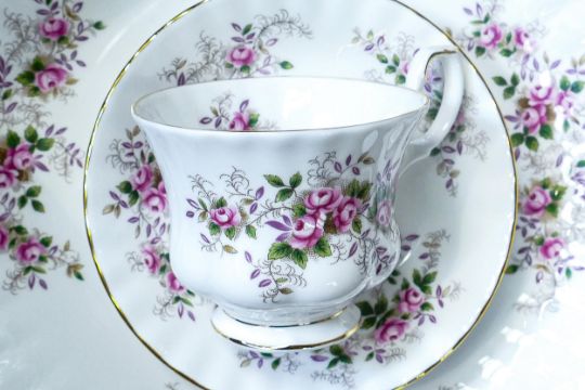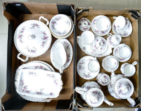 Royal Albert Lavender Rose patterned tea, coffee & dinner ware to include part tea set, coffee pot, coffee cups & saucers, bowls, tureen, dinner plates etc. (46 pieces in 2 trays)