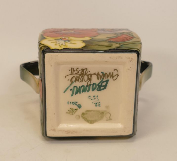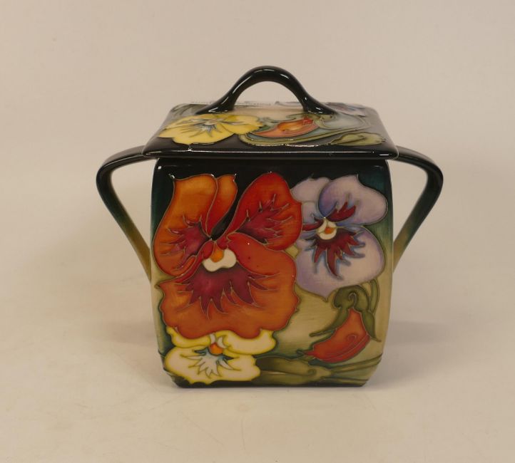 Moorcroft pansy biscuit barrel. Limited edition 32/150, signed and dated by Emma Bossons. Height 13cm