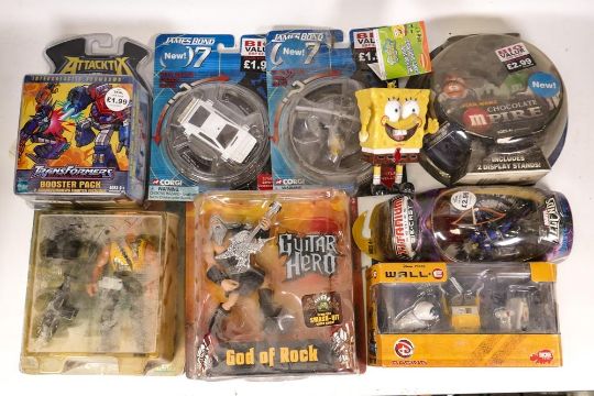 A mixed collection of Carded Figures & Vehicles including Guitar Hero God of Rock, Disney Wall E , Marvel Legends Hawkeye, Chocolate Mpire, Transformers Booster Pack Terminator 2 Meltdown Terminator & Corgi James Bond Vehicles (9)
