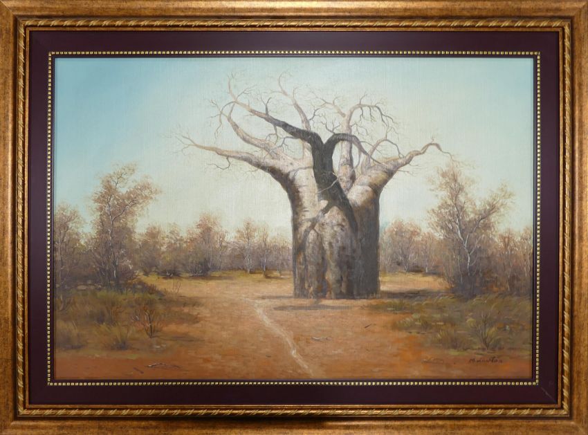 M Lawton (SOUTH AFRICAN 20th century) framed oil on canvas, landscape with tree, measuring 59cm x 87cm excluding frame & slip, overall 80cm x 109cm.