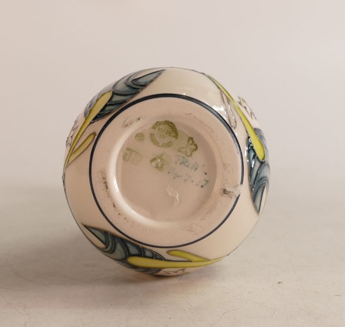 Moorcroft trial bud vase with white bluebells, dated 14/7/2017, production fault to base, height 17cm