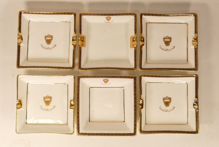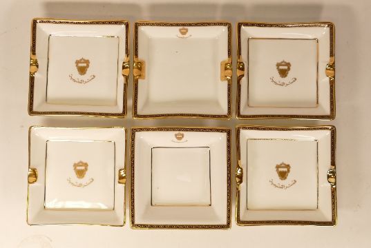 Six De Lamerie Fine Bone China heavily gilded Special Commission patterned Ashtrays with with Gudaibiya Palace Motif, specially made high end quality item, Made in England, length 12cm(6)