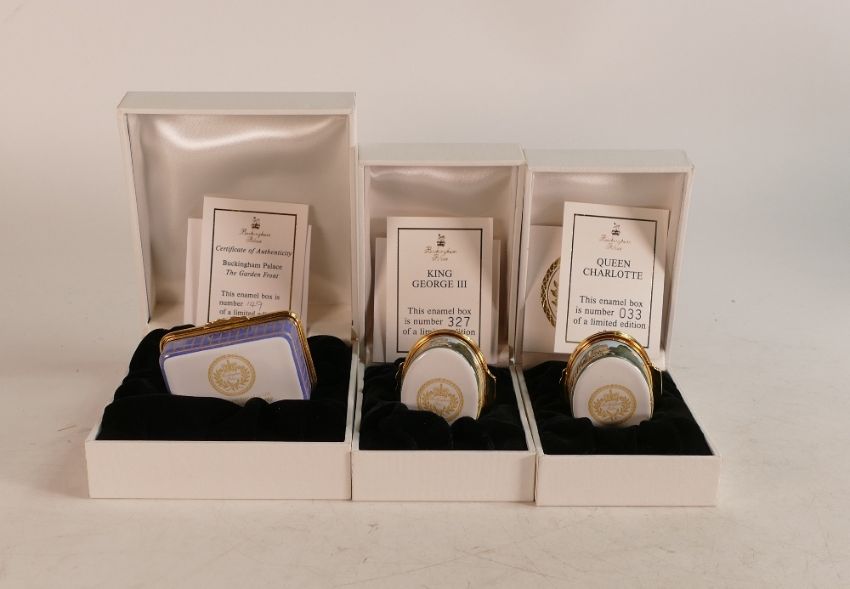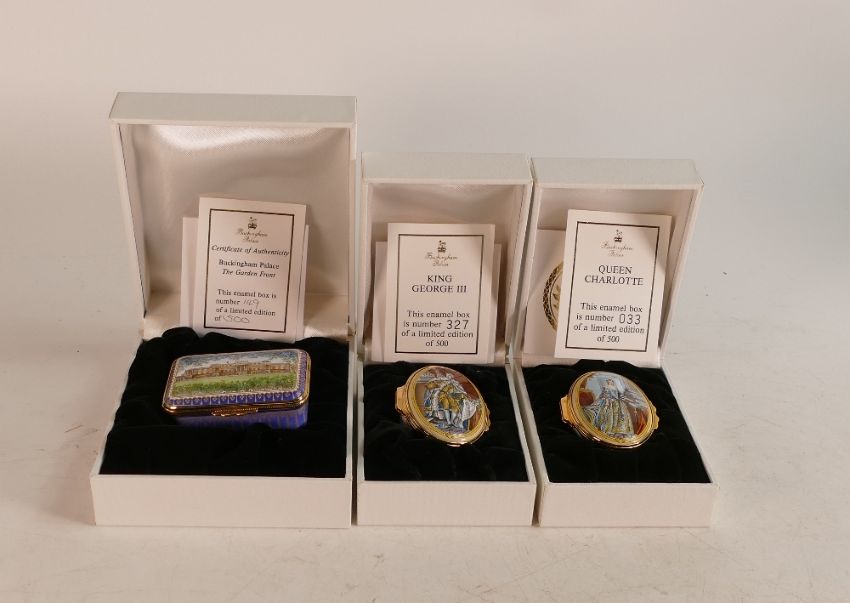 Buckingham Palace enamelled lidded boxes to include The Garden Front , King George III and Queen Charlotte. All boxed , limited editions with certificates (3)