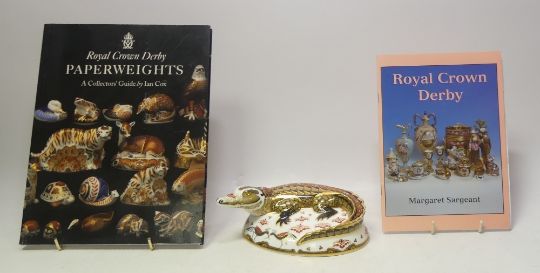 Boxed Royal Crown Derby Paperweight Crocodile. 21st Anniversary Gold Stopper. Includes a Royal Crown Derby Collectors Guide and Leaflet by Margaret Sargeant (3)