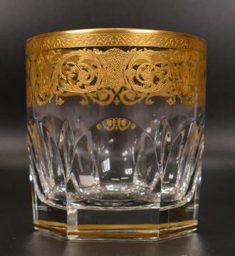 Four De Lamerie Fine Bone China heavily gilded Robert Adam Pattern Whisky Tumbler Glasses , in presentation box & bag, specially made high end quality item, Made in England, height 8.5cm (4)