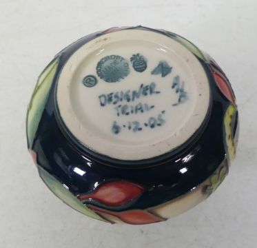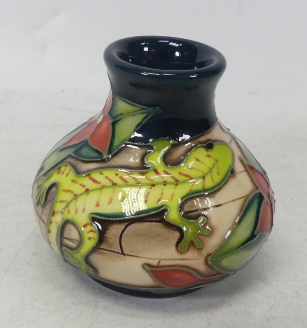 Moorcroft miniature designer trial vase 06.12.05 lizards and flowers on beige/ dark turquoise ground, height 5.5cm(boxed)