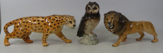 Beswick selection of animals to include prowling leopard, Growling Lion also Royal Doulton Short Eared Owl empty decater Whyte & Mackay(3)